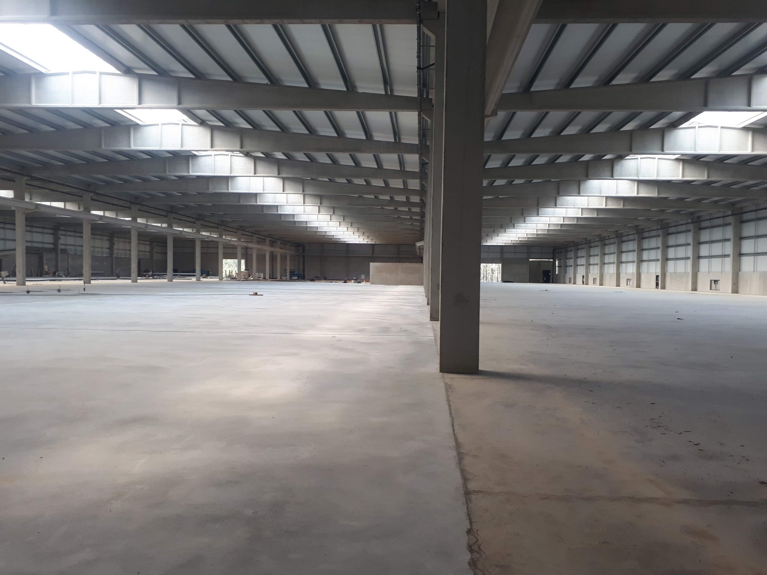 Execution of an industrial concrete floor for the ground level of a logistics warehouse, covering approx. 18,000 m² (≈ 193,750 ft²). The system applied was RCR Conductil SFRC with 18 cm thick concrete, reinforced with 30 kg/m³ of ROC-FIBRAS TR65/50 (steel fibers).